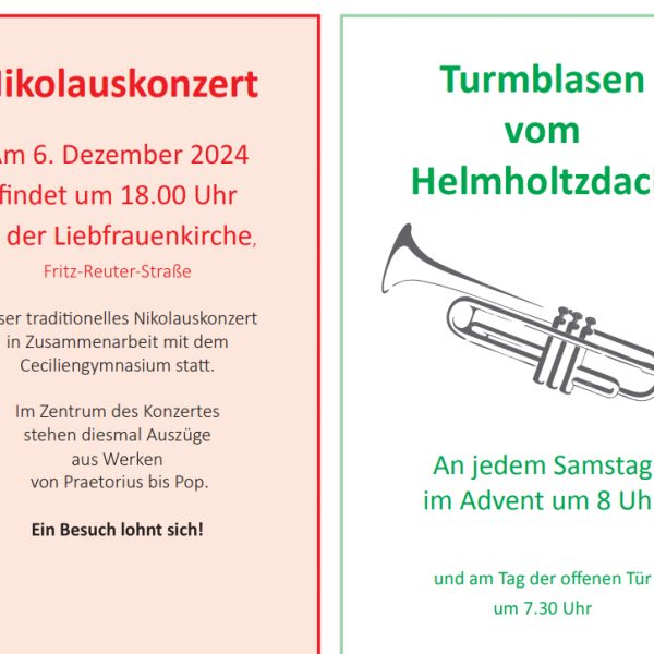 Auch in diesem Jahr erklingen an jedem Adventssamstag traditionelle Advents- und Weihnachtslieder vom Dach des Helmholtz-Gymnasiums. Am Tag der offenen Tür am Samstag, 29.11.2025, starten die Bläser bereits um 7.30 Uhr. An allen weiteren Adventssamstagen beginnt die Musik um 8.00 Uhr. Am Samstag, 6.12.2025, findet um 18.00 Uhr das Nikolauskonzert des Helmholtz- und des Ceciliengymnasiums…