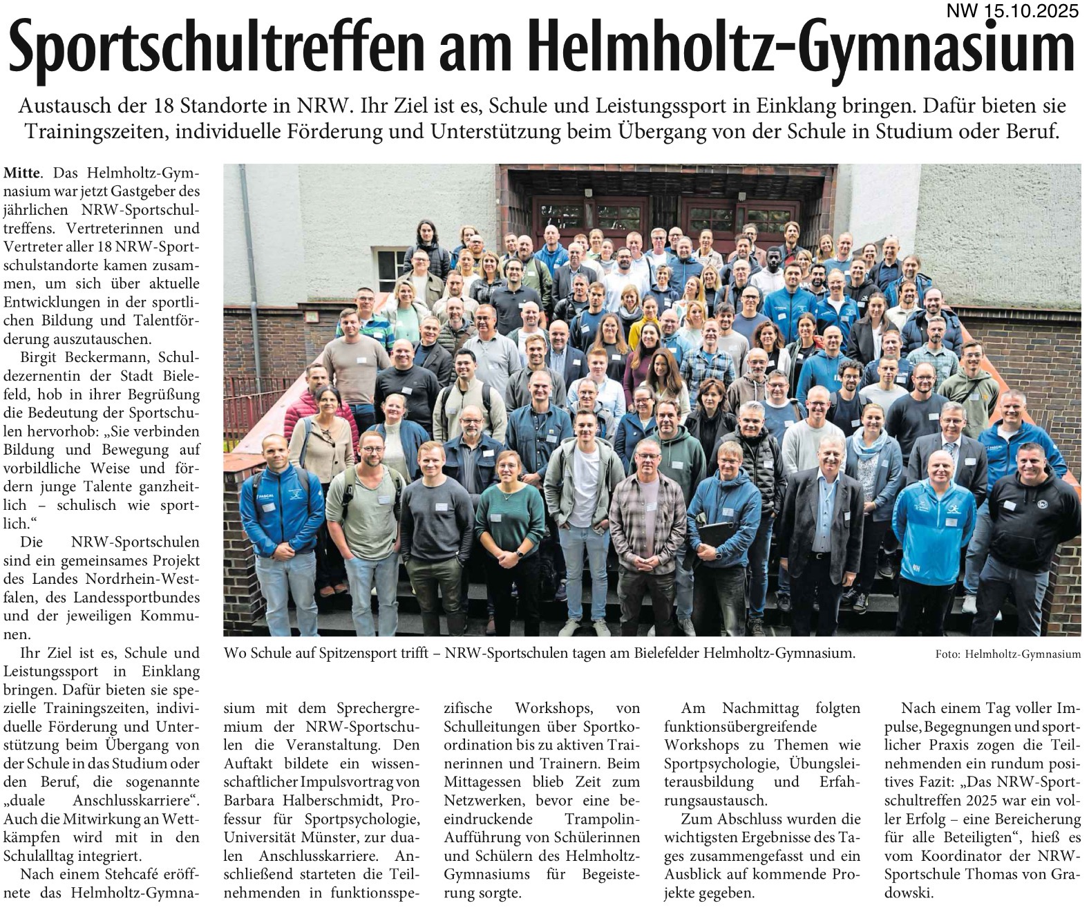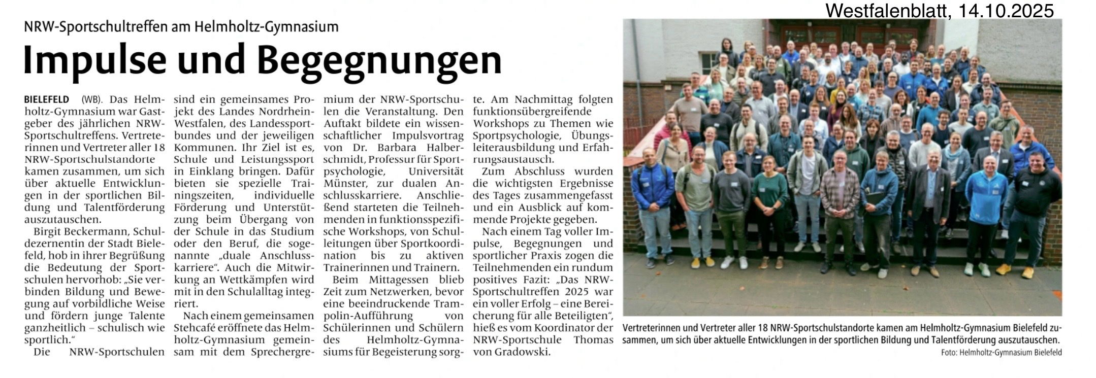Am 7. Oktober 2025 durften wir am Helmholtz-Gymnasium Bielefeld Gastgeber des diesjährigen NRW-Sportschultreffens sein. Vertreterinnen und Vertreter aller 18 NRW-Sportschulen kamen zu uns, um sich über aktuelle Entwicklungen in der sportlichen Bildung und Talentförderung auszutauschen.