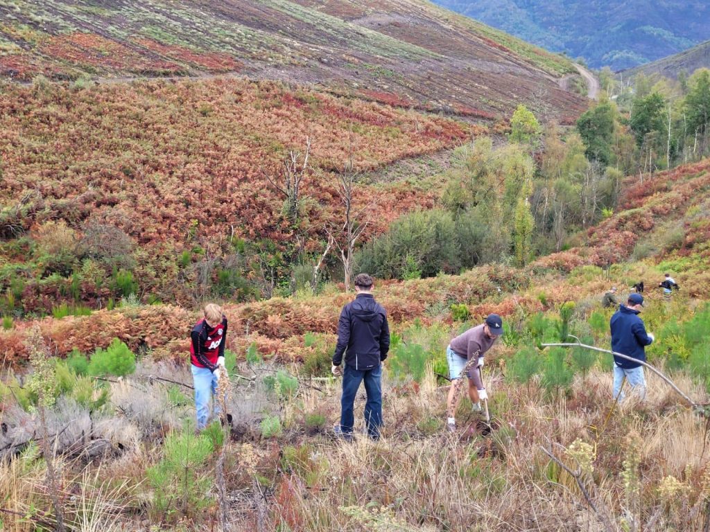 Zwei Referendare des Helmholtz-Gymnasiums haben an einem ERASMUS+-Jobshadowing an der spanischen Schule IES Monte da Vila teilgenommen und hierbei spannende Erfahrungen sammeln und neue Erkenntnisse in Bezug auf aktiven Umweltschutz gewinnen können. Es zeigte sich, wie durch die Realisation von Projektarbeiten im internationalen Austausch nicht nur das Bewusstsein von Schüler:innen für den Handlungsbedarf im Zusammenhang mit dem Klimawandel fördern lässt, sondern wie tatsächlich etwas bewirkt werden kann. In Zusammenarbeit mit lokalen Forst- und Umweltbeauftragten in der von verheerenden Waldbränden betroffenen Regionen Galiziens, wurden Genehmigungen eingeholt und Infrastrukturen etabliert, die es ermöglicht haben, ein Aufforstungsprojekt zu realisieren, bei dem Schüler:innen über tausend Bäume gepflanzt haben. Durch das Anlegen von Pflanzclustern mit hitzetoleranten Arten soll eine Biodiversität gefördert werden, die einen natürlichen Schutz vor den wiederkehrenden Waldbränden aufweist, wodurch ein nachhaltiges Waldökosystem etabliert werden kann.