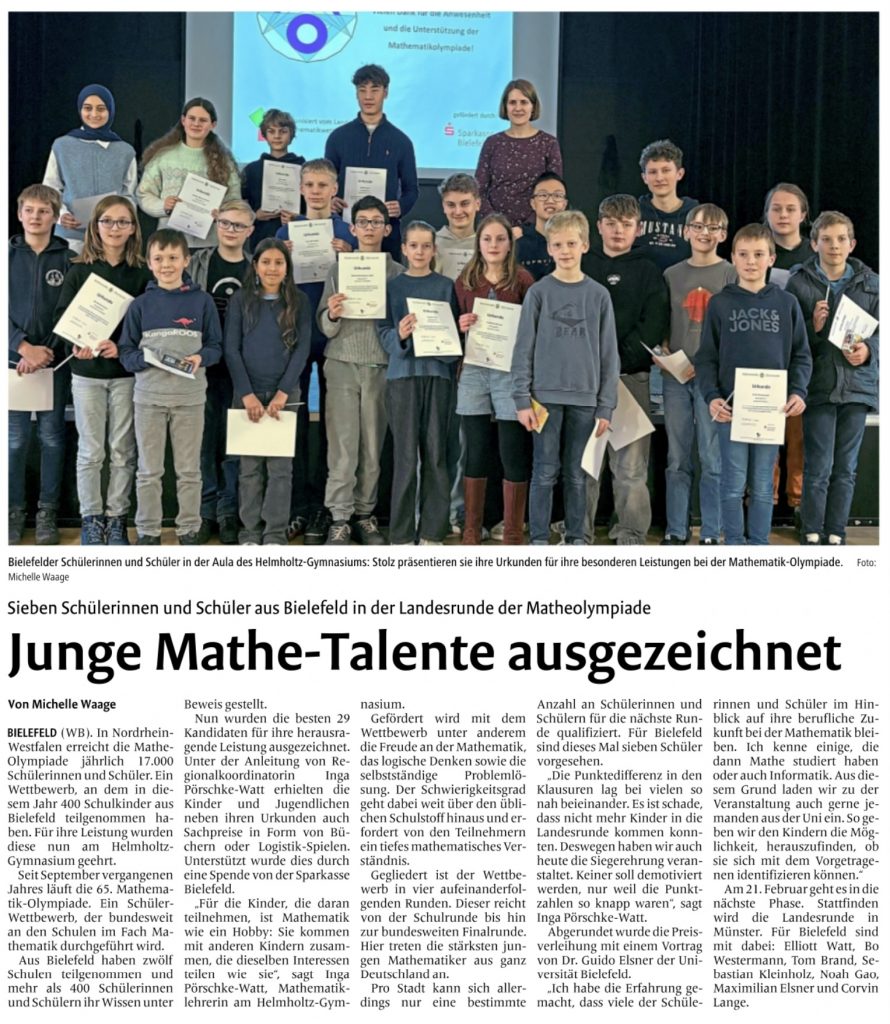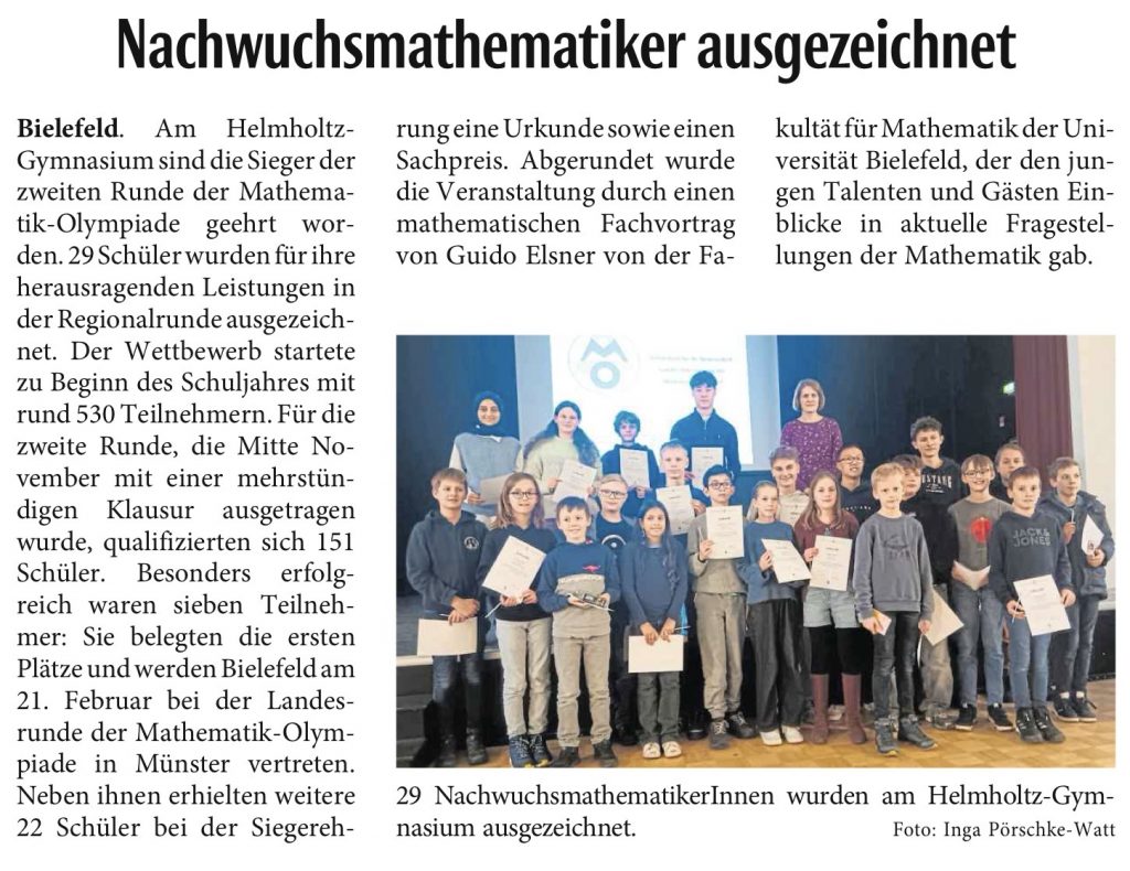Am 16.1. hat in der Aula des Helmholtz-Gymnasiums die Siegerehrung der 2. Runde der Mathematik-Olympiade stattgefunden. Insgesamt wurden 29 Schülerinnen und Schüler aus Bielefeld für ihre herausragenden Leistungen bei der Regionalrunde geehrt. Gestartet hat der Wettbewerb zum Schuljahresbeginn mit ca. 530 Teilnehmern bei der ersten Runde. Zur 2. Runde, bei welcher Mitte November im Helmholtz-Gymnasium Klausuren geschrieben wurden, hatten sich 151 TeilnehmerInnen qualifiziert. Insgesamt 7 Teilnehmer werden am 21.2. Bielefeld bei der Landesrunde der Mathematikolympiade in Münster vertreten. Bei der Siegerehrung am Freitag erhielten diese 7 Erstplatzierten und 22 weitere SchülerInnen mit besonders guten Ergebnissen eine Urkunde und einen Sachpreis, welcher durch die Sparkasse Bielefeld finanziert wurde. Abgerundet wurde die Siegerehrung durch einen mathematischen Vortrag von Dr. Guido Elsner (Fakultät für Mathematik). Vom Helmholtz-Gymnasium erhielt David Jasper aus der 10a einen Anerkennungspreis und Elliot Watt aus der 5c einen 1. Preis. Elliot hat sich damit auch für die Landesrunde in Münster qualifiziert.
